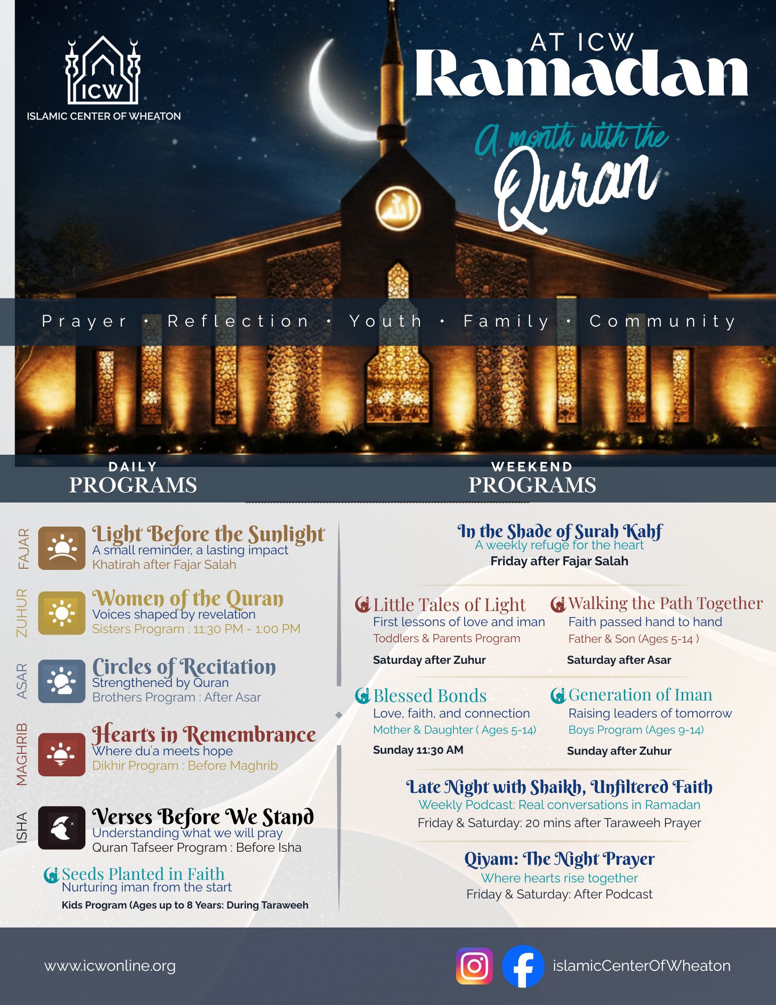 Amid the many houses of worship in Wheaton, ICW stands as the community’s spiritual anchor — the only Islamic institution serving as a beacon of light at the corner of Wheaton, Glendale Heights, Glen Ellyn, Carol Stream, and beyond.